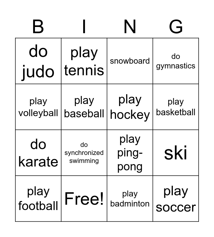 This bingo card has 16 words: Free!, ski, snowboard, do judo, do karate, play tennis, play ping-pong, play badminton, play volleyball, play baseball, play football, do gymnastics, do synchronized swimming, play basketball, play hockey and play soccer.