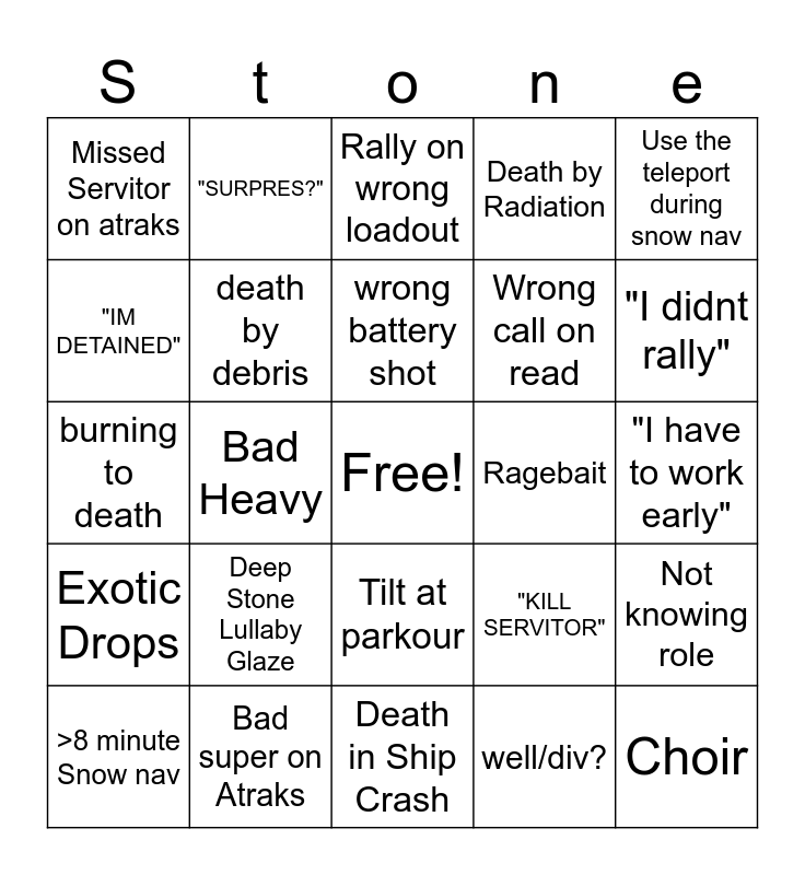 This bingo card has a free space and 24 words: Deep Stone Lullaby Glaze, Bad super on Atraks, wrong battery shot, >8 minute Snow nav, Use the teleport during snow nav, Missed Servitor on atraks, "IM DETAINED", "SURPRES?", Ragebait, Tilt at parkour, Wrong call on read, burning to death, "KILL SERVITOR", Not knowing role, death by debris, well/div?, "I have to work early", Rally on wrong loadout, "I didnt rally", Bad Heavy, Choir, Exotic Drops, Death by Radiation and Death in Ship Crash.