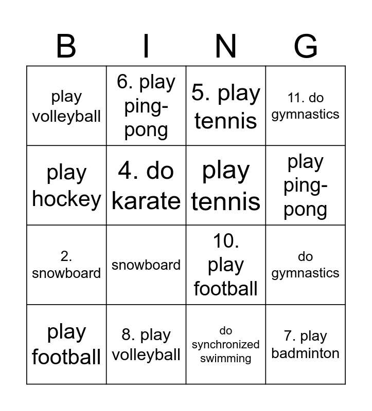 This bingo card has 28 words: Free!, 1.ski, 2. snowboard, 3. do judo, 4. do karate, 5. play tennis, 6. play ping-pong, 7. play badminton, 8. play volleyball, 9. play baseball, 10. play football, 11. do gymnastics, 12. do synchronized swimming, ski, snowboard, do judo, do karate, play tennis, play ping-pong, play badminton, play volleyball, play baseball, play football, do gymnastics, do synchronized swimming, play soccer, play hockey and play basketball.