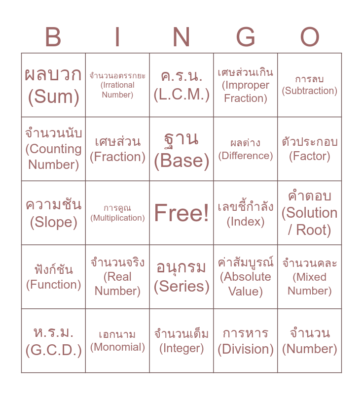 This bingo card has a free space and 51 words: canva, จำนวน (Number), ตัวเลข (Digit), จำนวนเต็ม (Integer), จำนวนจริง (Real Number), จำนวนตรรกยะ (Rational Number), จำนวนอตรรกยะ (Irrational Number), จำนวนเฉพาะ (Prime Number), จำนวนนับ (Counting Number), ทศนิยม (Decimal), เศษส่วน (Fraction), เศษส่วนเกิน (Improper Fraction), จำนวนคละ (Mixed Number), ค่าสัมบูรณ์ (Absolute Value), รากที่สอง (Square Root), เลขยกกำลัง (Exponent / Power), ฐาน (Base), เลขชี้กำลัง (Index), การบวก (Addition), การลบ (Subtraction), การคูณ (Multiplication), การหาร (Division), ผลบวก (Sum), ผลต่าง (Difference), ผลคูณ (Product), ผลหาร (Quotient), ตัวประกอบ (Factor), พหุคูณ (Multiple), ห.ร.ม. (G.C.D.), ค.ร.น. (L.C.M.), นิพจน์ (Expression), ตัวแปร (Variable), ค่าคงตัว (Constant), สัมประสิทธิ์ (Coefficient), พจน์ (Term), เอกนาม (Monomial), พหุนาม (Polynomial), ดีกรี (Degree), สมการ (Equation), อสมการ (Inequality), คำตอบ (Solution / Root), ฟังก์ชัน (Function), คู่อันดับ (Ordered Pair), กราฟ (Graph), พิกัด (Coordinate), แกน (Axis), ความชัน (Slope), จุดตัด (Intercept), ลำดับ (Sequence), อนุกรม (Series) and เซต (Set).