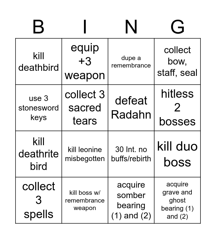 This bingo card has 51 words: collect haligtree medallion half, collect 3 spells, collect 3 incantations, mix physick flask w/ 2 tears, kill alexander, clear 2 evergoals, equip +3 weapon, defeat boss in altus plateau, collect 3 sacred tears, collect 4 physick tears, defeat Radahn, collect bow, staff, seal, defeat boss w/ jump attacks only, have 50k runes and die without using them, reach beast clergyman, kill bell bearing hunter, hitless 2 bosses, kill boss w/ remembrance weapon, kill boss w/ bow only, use 3 stonesword keys, kill duo boss, reach lvl 30, kill deathbird, kill deathrite bird, kill boss while on torrent, collect 3 talismans, kill leonine misbegotten, kill redwolf boss, kill soldier of godrick (fists only), dupe a remembrance, kill a boss spirit ashes only, complete 2 caves or grotto dungeons, kill tree sentinel w/ +0 weapon, kill a magma wyrm boss, kill greyoll without status effects, kill 2 nights cavalries, kill 2 tibia mariners, kill 3 bosses that ride a horse, restore a great rune, acquire smithing stone bearing (1) and (2), acquire somber bearing (1) and (2), acquire grave and ghost bearing (1) and (2), acquire 2 whetblades, kill 2 NPC invaders, kill 2 tree spirits, kill Lansseax, 30 Int. no buffs/rebirth, 30 Faith no buffs/rebirth, sell bloudhound fang +0, acquire 3 dragonhearts and kill 3 erdtree avatars.