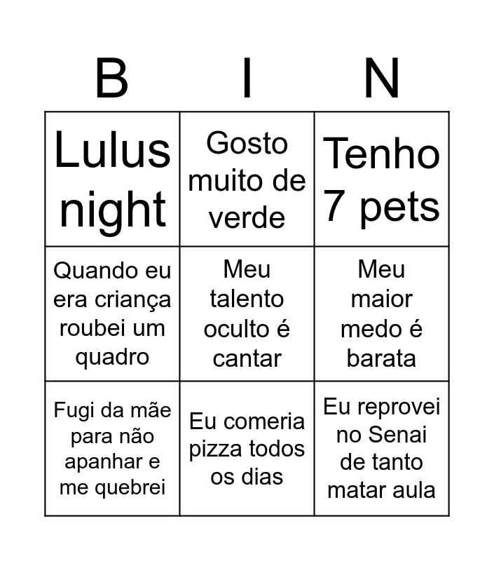 This bingo card has 9 words: Fugi da mãe para não apanhar e me quebrei, Tenho 7 pets, Gosto muito de verde, Quando eu era criança roubei um quadro, Lulus night, Meu maior medo é barata, Meu talento oculto é cantar, Eu reprovei no Senai de tanto matar aula and Eu comeria pizza todos os dias.