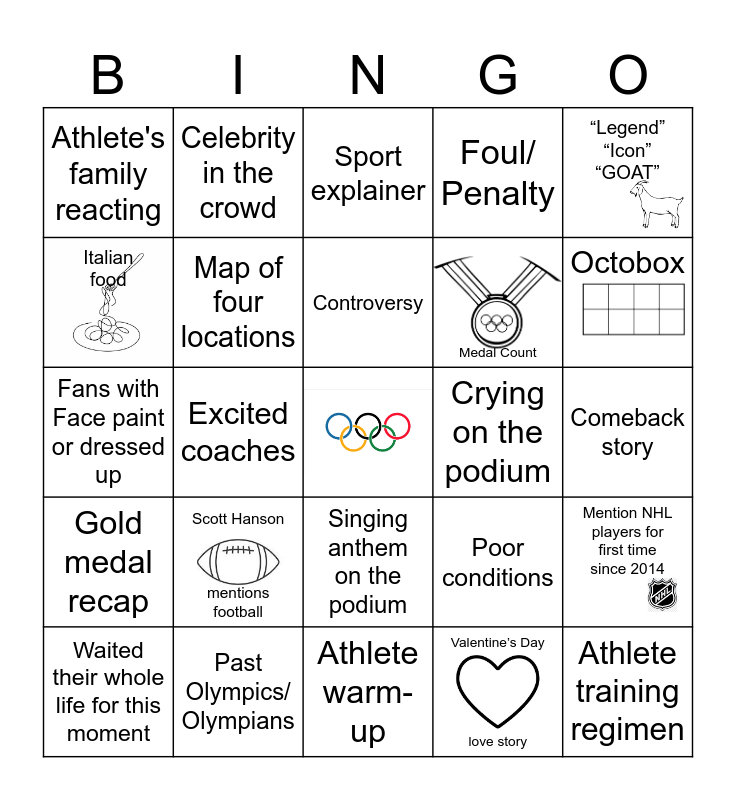 This bingo card has 7 images, a free space and 24 words: Scott Hanson mentions football, Past Olympics/ Olympians, Controversy, Waited their whole life for this moment, “Legend” “Icon” “GOAT”, Athlete's family reacting, Italian food, Celebrity in the crowd, Crying on the podium, Singing anthem on the podium, Medal Count, Fans with Face paint or dressed up, Poor conditions, Mention NHL players for first time since 2014, Map of four locations, Valentine’s Day love story, Comeback story, Sport explainer, Octobox, Excited coaches, Athlete training regimen, Gold medal recap, Foul/ Penalty and Athlete warm-up.