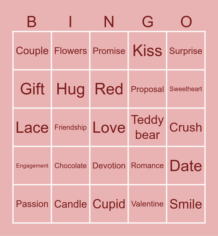 This bingo card has 51 words: Free!, Love, Heart, Cupid, Chocolate, Candy, Flowers, Rose, Gift, Card, Hug, Kiss, Date, Romance, Sweet, Pink, Red, Teddy bear, Balloon, Surprise, Friendship, Valentine, Couple, Proposal, Dinner, Smile, Sweetheart, Darling, Passion, Promise, Forever, Jewelry, Necklace, Ring, Perfume, Candle, Poem, Love letter, Secret admirer, Compliment, Crush, Engagement, Celebration, Bouquet, Stuffed animal, Confetti, Lace, Blush, Affection, Devotion and Happiness.