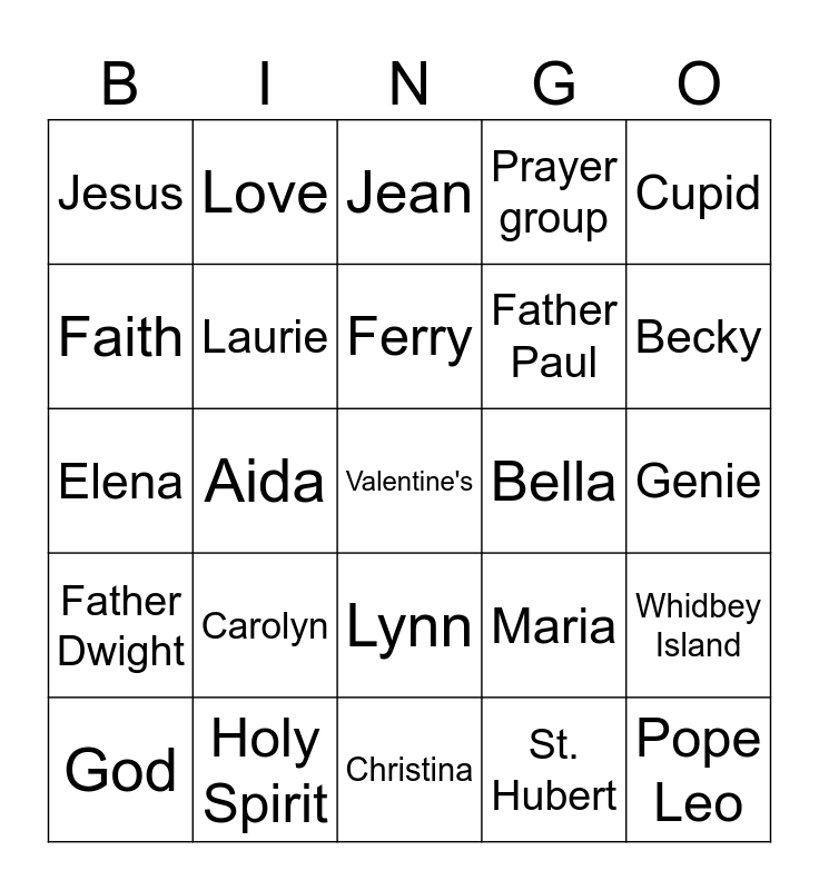 This bingo card has a free space and 29 words: God, Maralie, Aida, Mary Ann, Jesus, Jean, Laurie, Carolyn, Bella, Holy Spirit, Genie, Pope Leo, Christina, St. Hubert, Becky, Joan, Lynn, Father Dwight, Cupid, Elena, Maria, Paola, Father Paul, Faith, Prayer group, Love, Whidbey Island, Ferry and Susana.