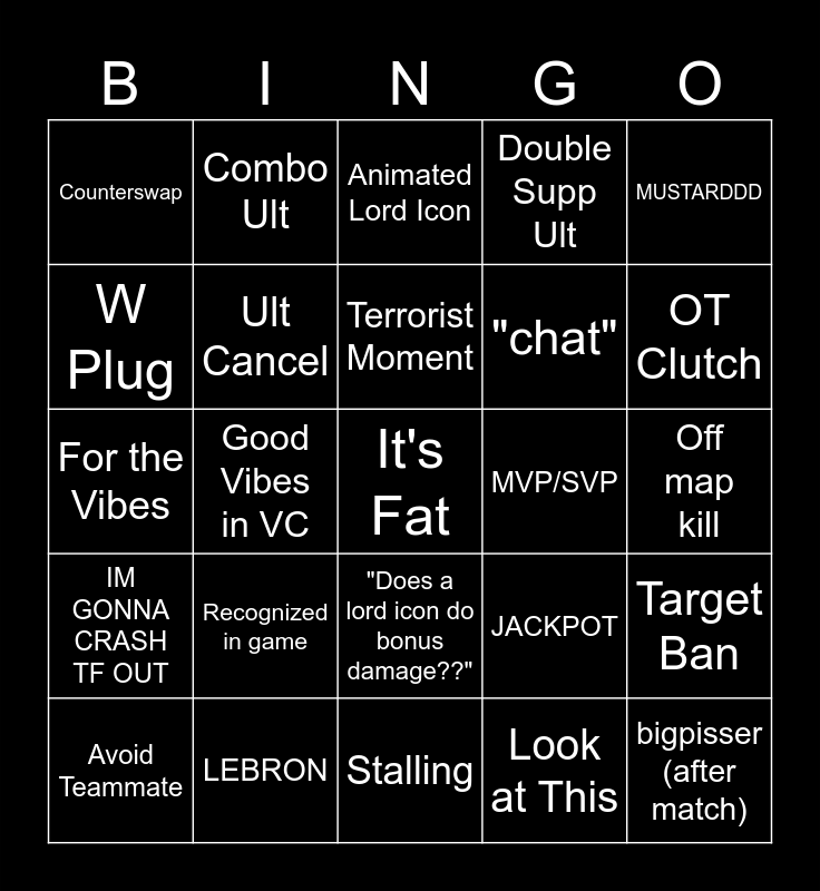 This bingo card has a free space and 40 words: Whiner in VC, For the Vibes, Strange TP, Ult Cancel, LEBRON, "Does a lord icon do bonus damage??", Terrorist Moment, Triple Supp, MUSTARDDD, IM GONNA CRASH TF OUT, Good Vibes in VC, Double Supp Ult, bigpisser (after match), Off map kill, MVP/SVP, Recognized in game, Whippin the Thing out, Counterswap, W Glaze, Animated Lord Icon, Target Ban, Look at This, "chat", W Plug, FEELIN A LIL STRANGE TODAYYY, hahahaha, "The Door", "mods ban 5 people", Team of Lords, mutted, Backline Warrior, Avoid Teammate, spider menace, JACKPOT, OT Clutch, Stalling, Actual Comms, DINNA TIME LAUV, Combo Ult and big double g mentioned.
