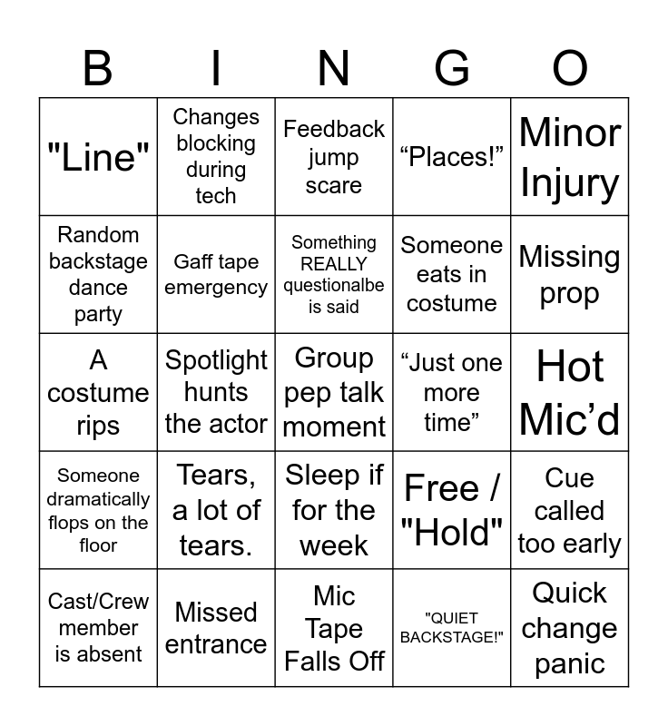 This bingo card has 25 words: Tears, a lot of tears., Mic Tape Falls Off, Something REALLY questionalbe is said, Cast/Crew member is absent, Minor Injury, "Line", Random backstage dance party, Changes blocking during tech, “Just one more time”, Sleep if for the week, Someone eats in costume, A costume rips, Free / "Hold", Cue called too early, Gaff tape emergency, Quick change panic, Hot Mic’d, Feedback jump scare, Missing prop, Spotlight hunts the actor, Group pep talk moment, Missed entrance, Someone dramatically flops on the floor, “Places!” and "QUIET BACKSTAGE!".