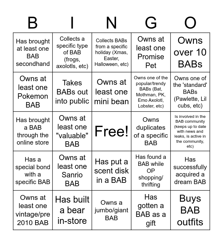 This bingo card has a free space and 24 words: Owns at least one Sanrio BAB, Has built a bear in-store, Owns at least one mini bean, Owns at least one vintage/pre 2010 BAB, Owns over 10 BABs, Has brought at least one BAB secondhand, Owns at least one Pokemon BAB, Collects a specific type of BAB (frogs, axolotls, etc), Owns duplicates of a specific BAB, Has put a scent disk in a BAB, Owns one of the popular/trendy BABs (Bat, Mothman, PK, Emo Axolotl, Lobster, etc), Has brought a BAB through the online store, Has found a BAB while OP shopping/ thrifting, Has successfully acquired a dream BAB, Takes BABs out into public, Has gotten a BAB as a gift, Is involved in the BAB community (keeps up to date with news and leaks, is active in the community, etc), Collects BABs from a specific holiday (Xmas, Easter, Halloween, etc), Owns one of the 'standard' BABs (Pawlette, Lil cubs, etc), Owns at least one "valuable" BAB, Buys BAB outfits, Has a special bond with a specific BAB, Owns at least one Promise Pet and Owns a jumbo/giant BAB.
