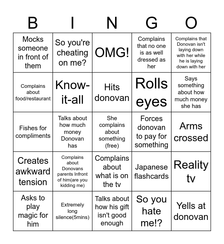 This bingo card has a free space and 24 words: Complains about Donovans parents Infront of him(are you kidding me), Extremely long silence(5mins), Hits donovan, Asks to play magic for him, Complains that Donovan isn't laying down with her while he is laying down with her, Mocks someone in front of them, Complains about food/restaurant, So you're cheating on me?, Forces donovan to pay for something, Complains about what is on the tv, Rolls eyes, Fishes for compliments, Japanese flashcards, Reality tv, Know-it-all, So you hate me!?, Arms crossed, OMG!, Says something about how much money she has, Talks about how much money Donovan has, Yells at donovan, Creates awkward tension, Complains that no one is as well dressed as her and Talks about how his gift isn't good enough.