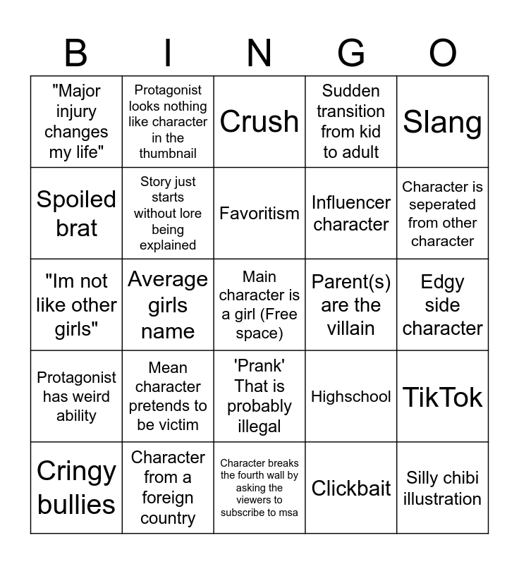 This bingo card has a free space and 24 words: Mean character pretends to be victim, Character from a foreign country, Favoritism, Cringy bullies, Slang, "Major injury changes my life", Spoiled brat, Protagonist looks nothing like character in the thumbnail, Parent(s) are the villain, 'Prank' That is probably illegal, Influencer character, "Im not like other girls", Highschool, TikTok, Story just starts without lore being explained, Clickbait, Edgy side character, Crush, Character is seperated from other character, Average girls name, Silly chibi illustration, Protagonist has weird ability, Sudden transition from kid to adult and Character breaks the fourth wall by asking the viewers to subscribe to msa.