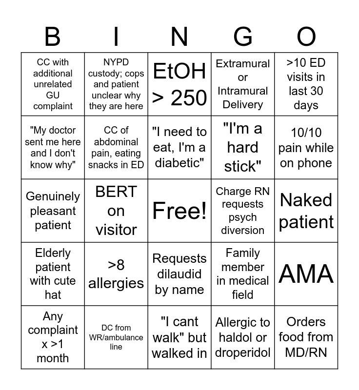 This bingo card has a free space and 24 words: >8 allergies, DC from WR/ambulance line, "I need to eat, I'm a diabetic", Any complaint x >1 month, >10 ED visits in last 30 days, CC with additional unrelated GU complaint, "My doctor sent me here and I don't know why", NYPD custody; cops and patient unclear why they are here, Charge RN requests psych diversion, Requests dilaudid by name, "I'm a hard stick", Genuinely pleasant patient, Family member in medical field, AMA, CC of abdominal pain, eating snacks in ED, Allergic to haldol or droperidol, Naked patient, EtOH > 250, 10/10 pain while on phone, BERT on visitor, Orders food from MD/RN, Elderly patient with cute hat, Extramural or Intramural Delivery and "I cant walk" but walked in.
