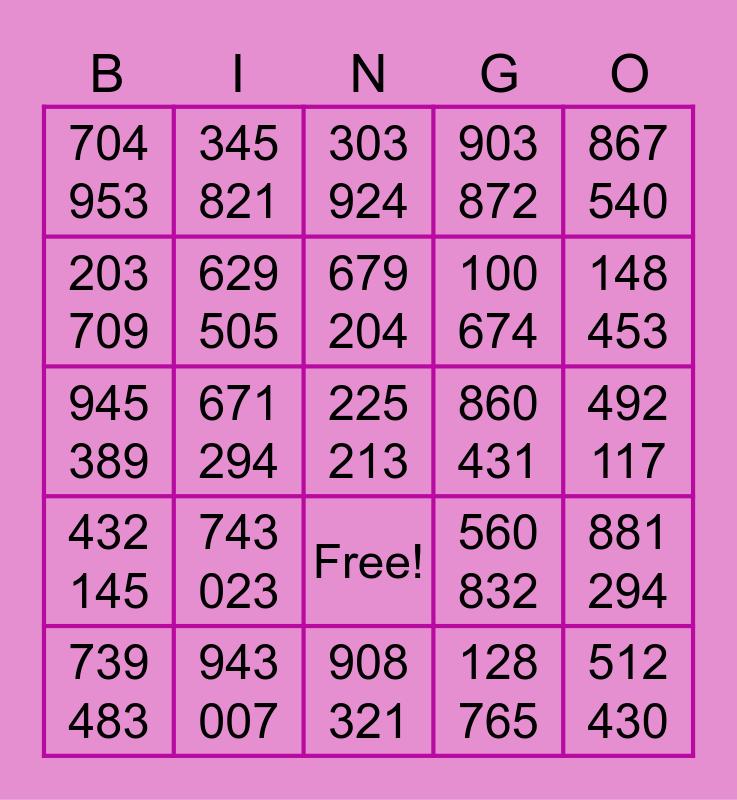 This bingo card has 26 words: Free!, 128 765, 679 204, 943 007, 867 540, 704 953, 203 709, 345 821, 492 117, 560 832, 100 674, 945 389, 881 294, 739 483, 671 294, 559 202, 903 872, 432 145, 303 924, 225 213, 148 453, 908 321, 860 431, 743 023, 629 505 and 512 430.