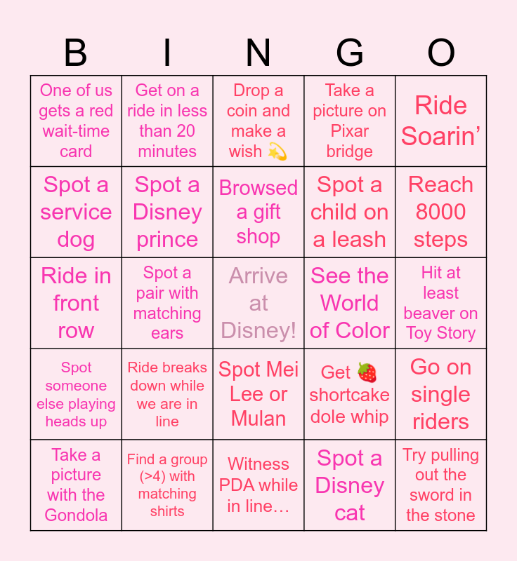 This bingo card has a free space and 29 words: Take a picture with the Gondola, Find a hidden Mickey, Spot a pair with matching ears, βDo you have water?β, One of us gets a red wait-time card, Drop a coin and make a wish π«, Spot a Disney prince, Ride breaks down while we are in line, See the World of Color, Find a group (>4) with matching shirts, Hit at least beaver on Toy Story, Try pulling out the sword in the stone, Witness PDA while in lineβ¦, Spot a Disney cat, Reach 8000 steps, Spot someone feeding a duck, Spot Mei Lee or Mulan, Spot someone else playing heads up, Ride Soarinβ, Ride in front row, Get πshortcake dole whip, Shawarma Kiosk, Spot a child on a leash, Spot a service dog, Take a picture on Pixar bridge, Get on a ride in less than 20 minutes, Go on single riders, Browsed a gift shop and Spot a couple holding hands.