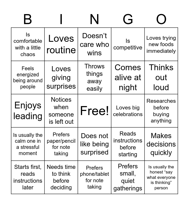 This bingo card has a free space and 35 words: Prefers supporting behind the scenes, Laughs loudly and freely, Smiles quietly but notices everything, Loves giving surprises, Does not like being surprised, Is competitive, Feels energized being around people, Keeps sentimental items for years, Throws things away easily, Rarely worries about details, Enjoys leading, Loves trying new foods immediately, Likes to order the same meal at a restaurant, Likes a very clean, tidy home, Is comfortable with a little chaos, Loves big celebrations, Prefers small, quiet gatherings, Notices when someone is left out, Is usually the calm one in a stressful moment, Is usually the honest “say what everyone is thinking” person, Reads instructions before starting, Starts first, reads instructions later, Makes decisions quickly, Needs time to think before deciding, Doesn’t care who wins, Thinks out loud, Processes thoughts internally, Loves early mornings, Comes alive at night, Researches before buying anything, Buys quickly if she likes it, Prefers phone/tablet for note taking, Prefers paper/pencil for note taking, Loves routine and Gets bored with routine.