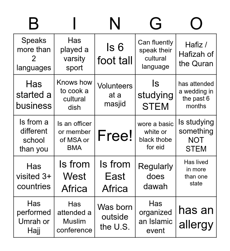 This bingo card has a free space and 24 words: Has performed Umrah or Hajj, Is from West Africa, Volunteers at a masjid, Has organized an Islamic event, Hafiz / Hafizah of the Quran, Speaks more than 2 languages, Has played a varsity sport, Is 6 foot tall, wore a basic white or black thobe for eid, Is studying something NOT STEM, Is from a different school than you, Knows how to cook a cultural dish, Regularly does dawah, Has lived in more than one state, Has started a business, Has attended a Muslim conference, Was born outside the U.S., Can fluently speak their cultural language, has attended a wedding in the past 6 months, Has visited 3+ countries, Is an officer or member of MSA or BMA, Is from East Africa, Is studying STEM and has an allergy.