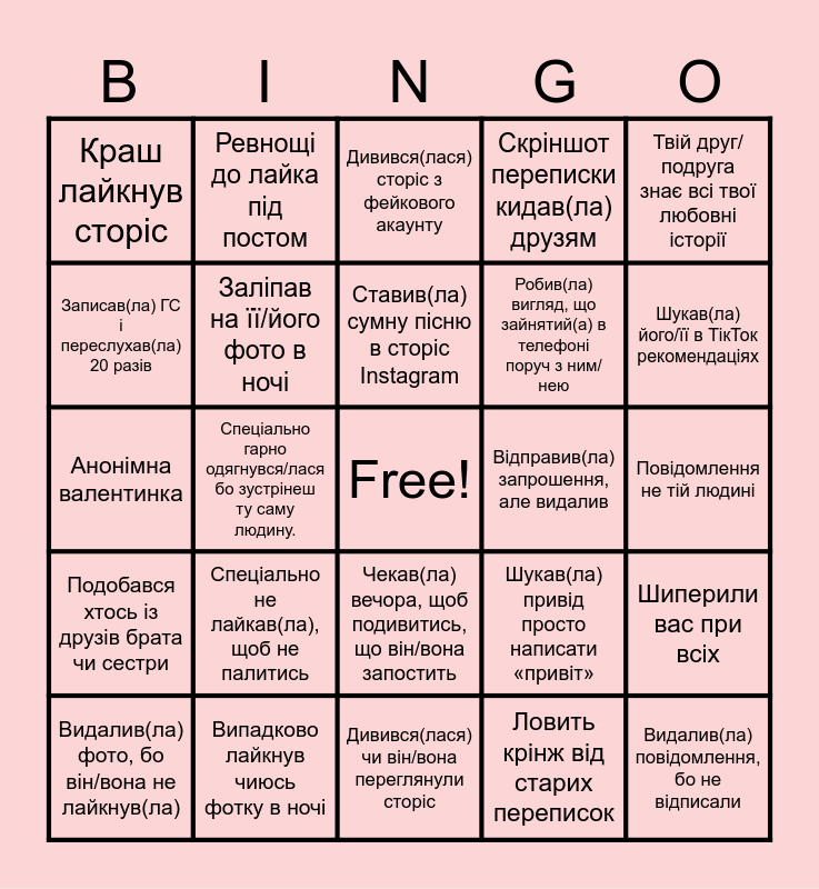 This bingo card has a free space and 47 words: Кинули в ігнор, Видалив(ла) повідомлення, бо не відписали, Сталкерив(ла) сторінку, Дивився(лася) чи він/вона переглянули сторіс, Спеціально не лайкав(ла), щоб не палитись, Переплутав(ла) діалоги в ТГ, Ревнощі до лайка під постом, Дивився(лася) на нього/неї на уроці, Записав(ла) ГС і переслухав(ла) 20 разів, Френдзона 80-го рівня, Заліпав на її/його фото в ночі, Скріншот переписки кидав(ла) друзям, Шиперили вас при всіх, Шукав(ла) привід просто написати «привіт», Чекав(ла) в мережі, поки він/вона напише першим, «Випадково» пройшов(ла) повз на перерві 5 разів, Ставив(ла) сумну пісню в сторіс Instagram, Відправив(ла) запрошення, але видалив, Знаєш про краша все, але в житті не вітаєтесь, Твій друг/подруга знає всі твої любовні історії, Спеціально гарно одягнувся/лася бо зустрінеш ту саму людину., Ловить крінж від старих переписок, Краш лайкнув сторіс, Робив(ла) вигляд, що зайнятий(а) в телефоні поруч з ним/нею, Не міг перестати дивитись на її/його фото, Шукав(ла) його/її в ТікТок рекомендаціях, Видалив(ла) фото, бо він/вона не лайкнув(ла), Маєш секретний чат або прихований діалог, Чекав(ла) вечора, щоб подивитись, що він/вона запостить, Подобався хтось із друзів брата чи сестри, Спільні пісні в плейлисті, Перевіряв(ла) «в мережі» кожні 5 хв, Гуляв(ла) під дощем, Малював(ла) сердечка в зошиті, Робив(ла) подарунок тій самій людині, Випадково лайкнув чиюсь фотку в ночі, Повідомлення не тій людині, Гадав вашу сумісність, Чекав(ла) поки напише весь вечір, Побачення в кіно, Слухав(ла) сумний плейлист, Дивився(лася) сторіс з фейкового акаунту, Анонімна валентинка, Боявся(лася) написати першим(ою), Видаляв(ла) переписку в пориві емоцій, Таємна папка з фото в телефоні and Завісав(ла) на її/його профілі.