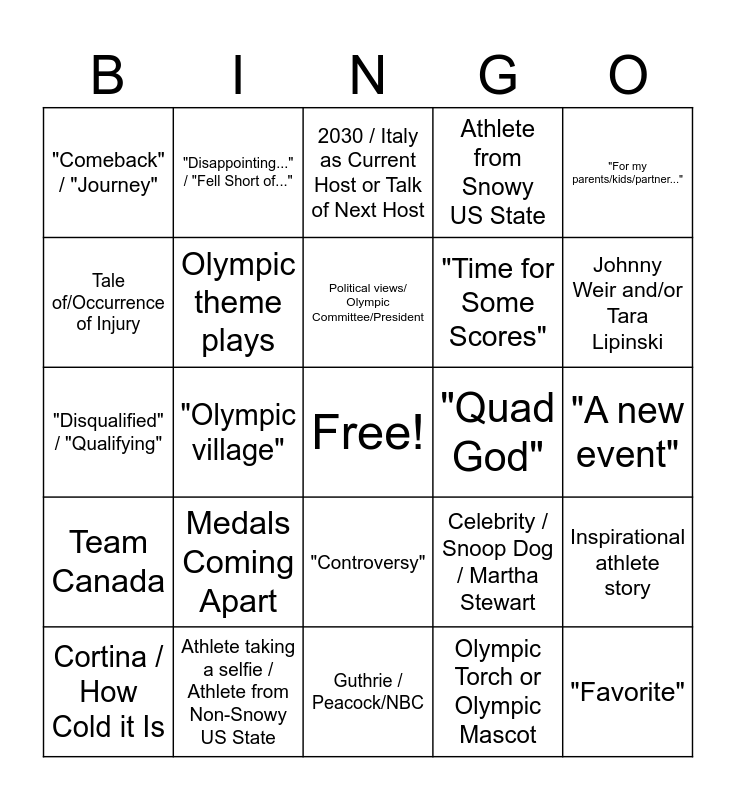 This bingo card has a free space and 25 words: Medals Coming Apart, Guthrie / Peacock/NBC, Political views/ Olympic Committee/President, Cortina / How Cold it Is, "For my parents/kids/partner...", "Comeback" / "Journey", Tale of/Occurrence of Injury, "Disappointing..." / "Fell Short of...", "Quad God", "Controversy", "Time for Some Scores", "Disqualified" / "Qualifying", Celebrity / Snoop Dog / Martha Stewart, Inspirational athlete story, Olympic theme plays, Nation w/ < 10 athletes/ Country Never Heard Of, "A new event", 2030 / Italy as Current Host or Talk of Next Host, Johnny Weir and/or Tara Lipinski, "Olympic village", "Favorite", Athlete taking a selfie / Athlete from Non-Snowy US State, Team Canada, Athlete from Snowy US State and Olympic Torch or Olympic Mascot.