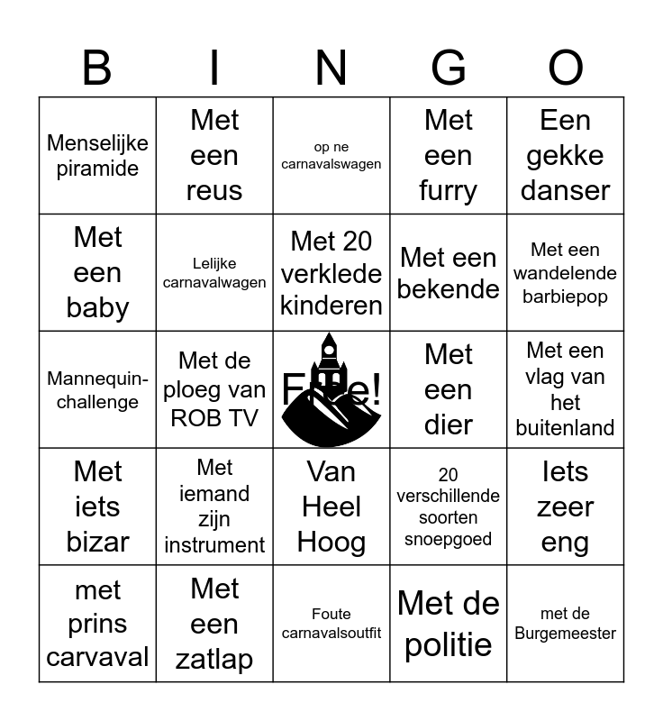 This bingo card has a free space and 24 words: met prins carvaval, Met iemand zijn instrument, Met 20 verklede kinderen, Met de politie, Een gekke danser, Menselijke piramide, Met een reus, op ne carnavalswagen, Met een dier, Met een vlag van het buitenland, Mannequin-challenge, Lelijke carnavalwagen, 20 verschillende soorten snoepgoed, Iets zeer eng, Met een baby, Met een zatlap, Foute carnavalsoutfit, Met een furry, Met een wandelende barbiepop, Met iets bizar, Met de ploeg van ROB TV, Van Heel Hoog, Met een bekende and met de Burgemeester.