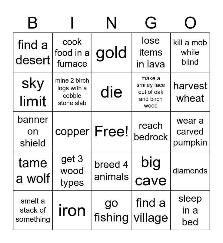 This bingo card has a free space and 24 words: get 3 wood types, iron, die, smelt a stack of something, kill a mob while blind, find a desert, sky limit, cook food in a furnace, reach bedrock, breed 4 animals, make a smiley face out of oak and birch wood, banner on shield, big cave, diamonds, mine 2 birch logs with a cobble stone slab, find a village, wear a carved pumpkin, gold, harvest wheat, copper, sleep in a bed, tame a wolf, lose items in lava and go fishing.