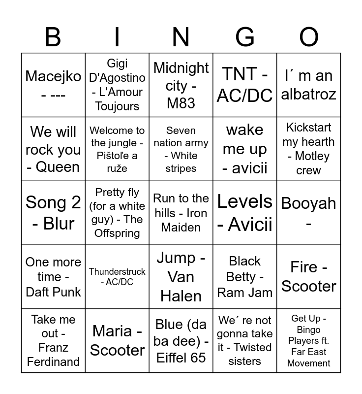 This bingo card has a free space and 24 words: Thunderstruck - AC/DC, Maria - Scooter, Seven nation army - White stripes, Take me out - Franz Ferdinand, I´ m an albatroz, Macejko - ---, We will rock you - Queen, Gigi D'Agostino - L'Amour Toujours, Levels - Avicii, Jump - Van Halen, wake me up - avicii, Song 2 - Blur, Black Betty - Ram Jam, Fire - Scooter, Welcome to the jungle - Pištoľe a ruže, We´ re not gonna take it - Twisted sisters, Booyah -, Midnight city - M83, Kickstart my hearth - Motley crew, Pretty fly (for a white guy) - The Offspring, Get Up - Bingo Players ft. Far East Movement, One more time - Daft Punk, TNT - AC/DC and Blue (da ba dee) - Eiffel 65.