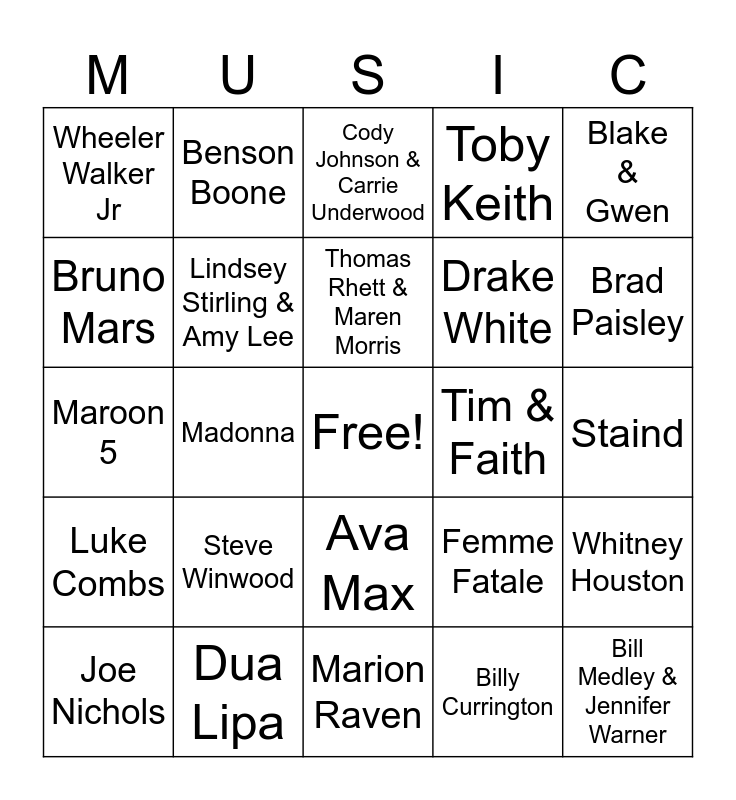 This bingo card has a free space and 59 words: Chris Isaak, Dua Lipa, Enrique Iglesias, Luke Combs, Billy Currington, Daneliya Tuleshova, Lindsey Stirling & Amy Lee, Carrie & Brad, Drake White, Thomas Rhett, Toby Keith, Garth Brooks, Bruno Mars, Meat Loaf, A-Ha, Wheeler Walker Jr, Bill Medley & Jennifer Warner, Blake & Gwen, Harry Styles, Thomas Rhett & Maren Morris, Tim & Faith, Cody Johnson & Carrie Underwood, Joe Nichols, Whitney Houston, Leann Rimes, Selena, John Legend & Lindsey Stirling, Cyndi Lauper, Brad Paisley, Ed Sheeran 1, K-Ci & JoJo, Taylor Swift, Train, Michael Buble, Benson Boone, Billy Eilish, Marc Anthony, Madonna, Ed Sheeran 2, Maroon 5, Paula Cole, Steve Winwood, Staind, Golden Earring, David Bowie, Holly Valance, Hot Chocolate, Mark Morrison, Ava Max, Marion Raven, Notorious BIG, Priscilla Block, R.E.M., Joe Cocker, Jet, Femme Fatale, Elvis Presley, Roxette and Saving Abel.