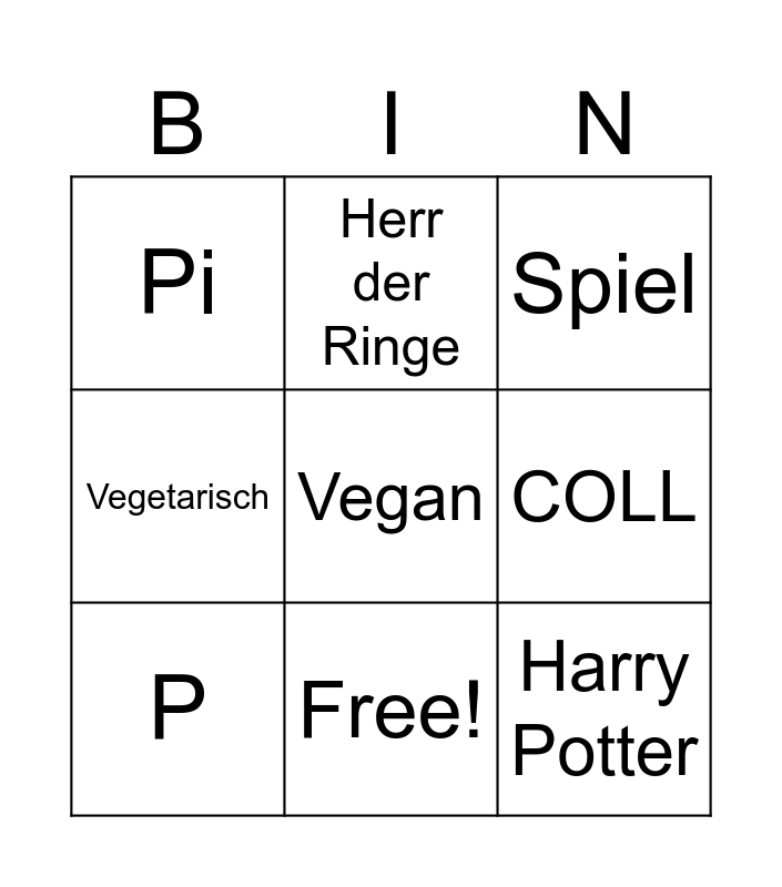 This bingo card has 10 words: Free!, Spiel, Pi, Vegan, Vegetarisch, P, Herr der Ringe, C++, COLL and Harry Potter.