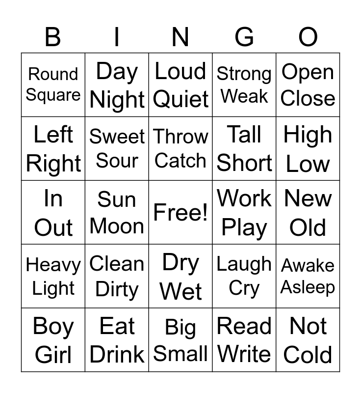 This bingo card has a free space and 49 words: Fast Slow, Not Cold, Up Down, Big Small, Clean Dirty, Old Young, Day Night, Soft Hard, Left Right, Right Wrong, Sweet Sour, Strong Weak, Awake Asleep, Laugh Cry, Push Pull, Sit Stand, Throw Catch, Work Play, Run Walk, Open Close, Sun Moon, Read Write, Round Square, Tall Short, Long Short, High Low, Boy Girl, Good Bad, Dry Wet, Heavy Light, Light Dark, Bright Dim, Deep Shallow, Empty Full, Eat Drink, Sharp Blunt, Inside Outside, Black White, New Old, Front Back, Happy Sad, Straight Curly, Man Woman, Follow Lead, In Out, Loud Quiet, On Off, Excited Bored and Angry Calm.