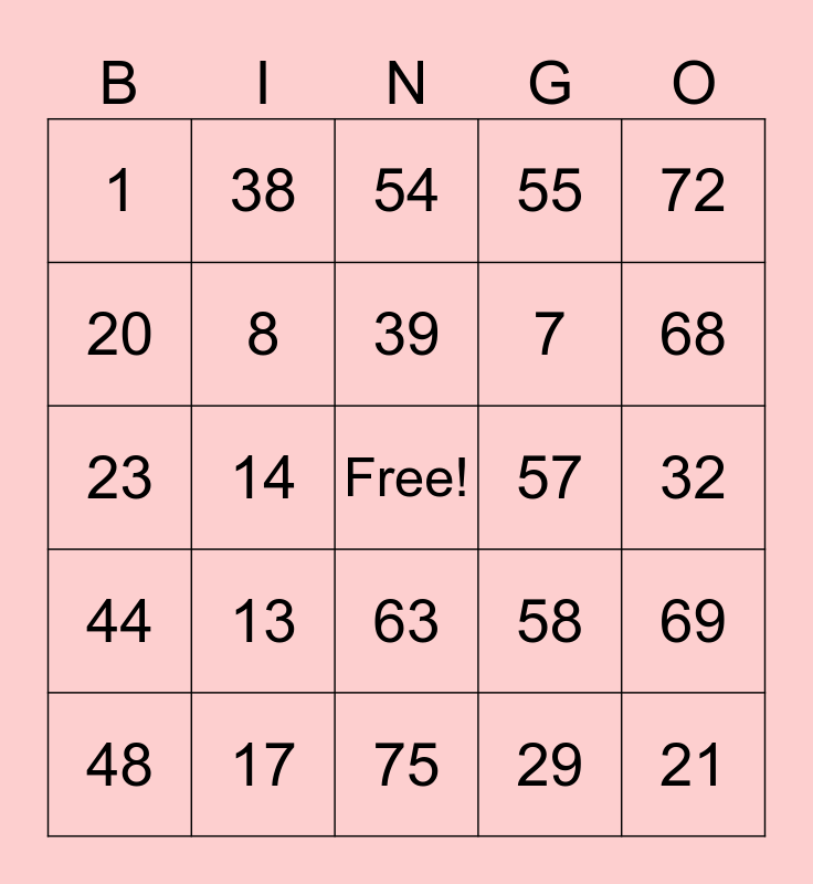 This bingo card has a free space and 24 words: 13, 17, 39, 48, 72, 1, 20, 38, 57, 63, 7, 23, 58, 69, 8, 29, 32, 54, 68, 14, 21, 44, 55 and 75.