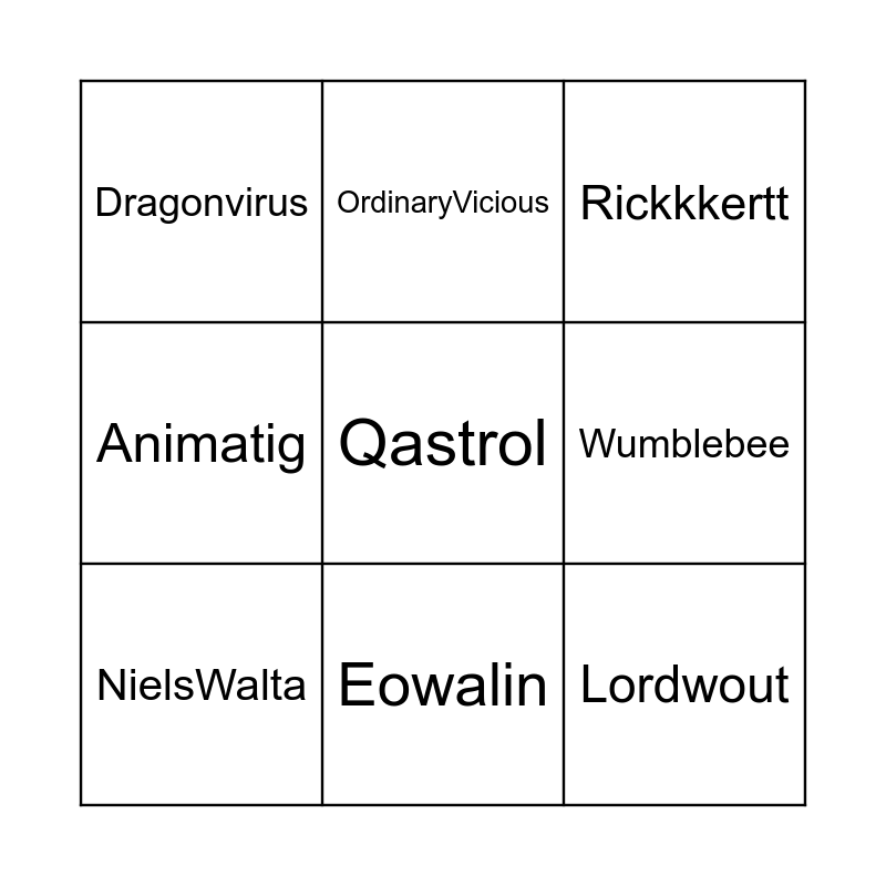 This bingo card has a free space and 8 words: Wumblebee, Rickkkertt, OrdinaryVicious, NielsWalta, Dragonvirus, Lordwout, Animatig and Eowalin.