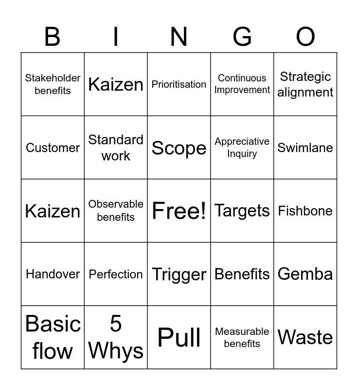 This bingo card has a free space and 46 words: Value, Waste, Flow, Pull, Perfection, TIMIWOOD, Kaizen, 5S, Customer, Stakeholder, Standard work, Continuous Improvement, Gemba, Benefits, Objective, Problem Statement, Scope, Targets, Direction, Strategic alignment, Observable benefits, Measurable benefits, Stakeholder benefits, Appreciative Inquiry, Process map, Swimlane, Basic flow, Detailed map, Trigger, Handover, Bottleneck, Failure Demand, Value Demand, Root Cause, Symptom, 5 Whys, Fishbone, Ishikawa, ECRS, Quick Wins, Impact / Difficulty, Prioritisation, Kaizen, Future State Map (To‑Be), Experiments and PDCA Cycle.