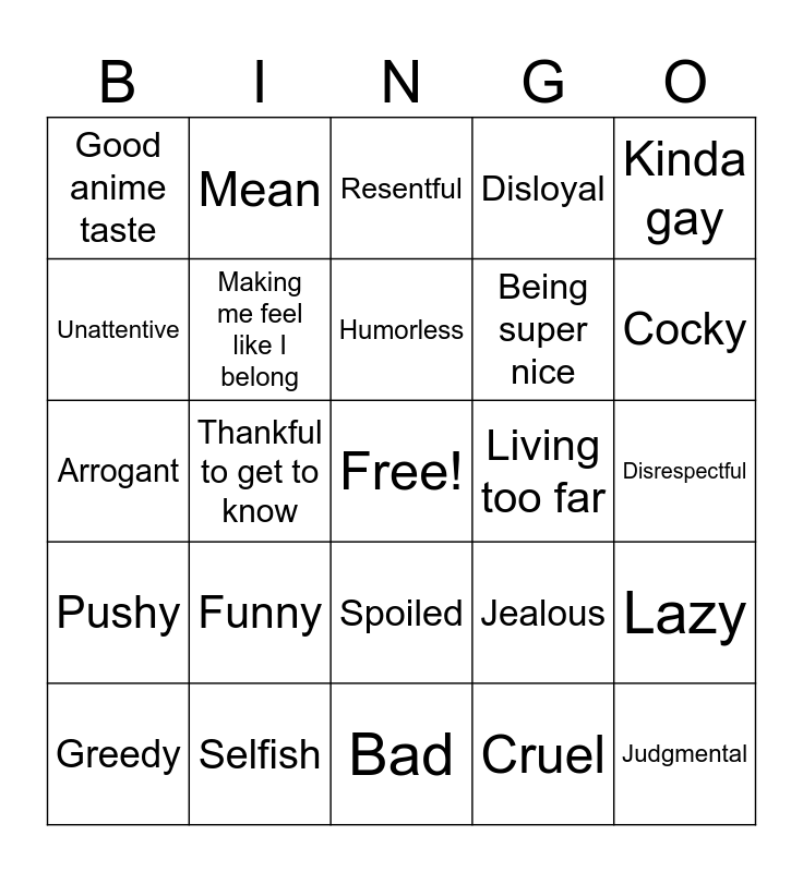 This bingo card has a free space and 24 words: Funny, Selfish, Humorless, Greedy, Kinda gay, Good anime taste, Unattentive, Mean, Living too far, Spoiled, Being super nice, Arrogant, Jealous, Lazy, Making me feel like I belong, Cruel, Disrespectful, Resentful, Cocky, Thankful to get to know, Judgmental, Pushy, Disloyal and Bad.