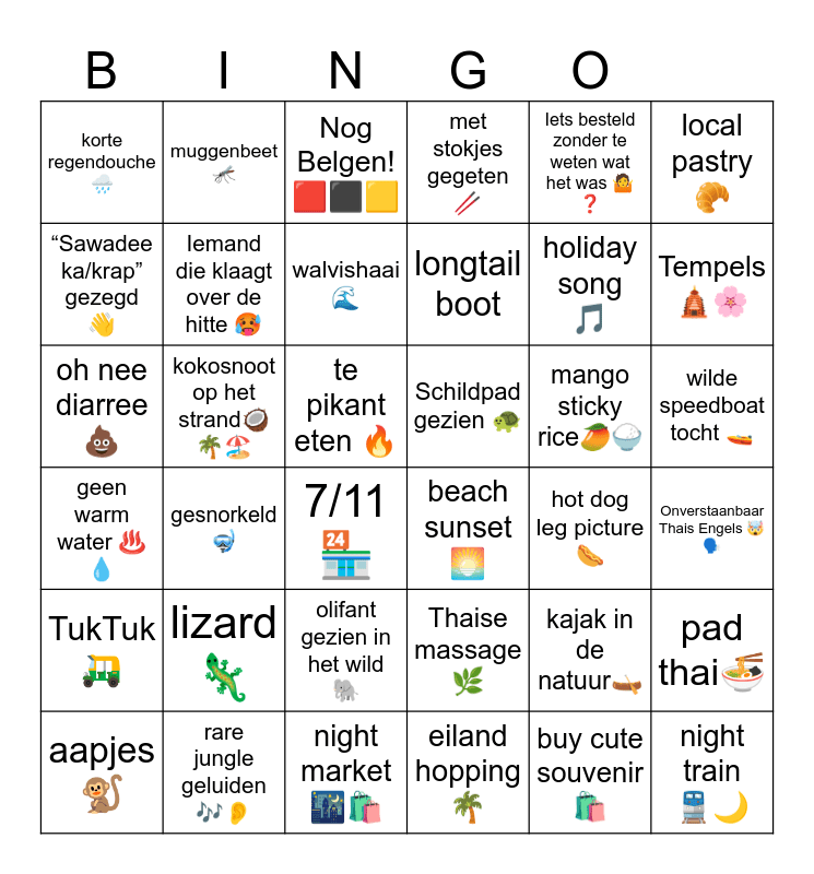 This bingo card has 36 words: Thaise massage🌿, olifant gezien in het wild 🐘, eiland hopping 🌴, “Sawadee ka/krap” gezegd 👋, geen warm water ♨️💧, Schildpad gezien 🐢, Iemand die klaagt over de hitte 🥵, night market 🌃🛍️, Iets besteld zonder te weten wat het was 🤷❓, kajak in de natuur🛶, Tempels 🛕🌸, met stokjes gegeten 🥢, pad thai🍜, kokosnoot op het strand🥥🌴🏖️, longtail boot, korte regendouche🌧️, TukTuk 🛺, mango sticky rice🥭🍚, oh nee diarree 💩, Nog Belgen! 🟥⬛🟨, te pikant eten 🔥, gesnorkeld 🤿, beach sunset 🌅, 7/11🏪, hot dog leg picture 🌭, muggenbeet🦟, holiday song 🎵, rare jungle geluiden 🎶👂, walvishaai🌊, local pastry 🥐, night train 🚆🌙, aapjes 🐒, Onverstaanbaar Thais Engels 🤯🗣️, wilde speedboat tocht 🚤, lizard 🦎 and buy cute souvenir 🛍️.