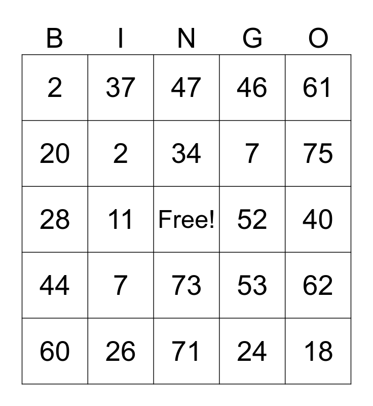 This bingo card has a free space and 24 words: 7, 26, 34, 60, 61, 2, 20, 37, 52, 73, 7, 28, 53, 62, 2, 24, 40, 47, 75, 11, 18, 44, 46 and 71.