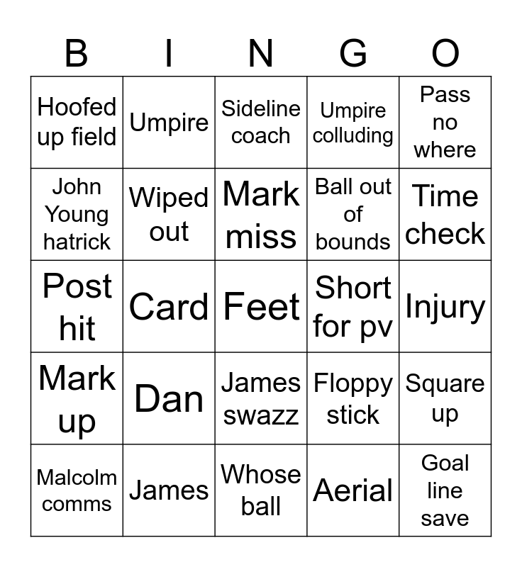 This bingo card has a free space and 24 words: Dan, James, Mark miss, Malcolm comms, Pass no where, Hoofed up field, John Young hatrick, Umpire, Short for pv, James swazz, Ball out of bounds, Post hit, Floppy stick, Square up, Wiped out, Aerial, Injury, Sideline coach, Time check, Card, Goal line save, Mark up, Umpire colluding and Whose ball.