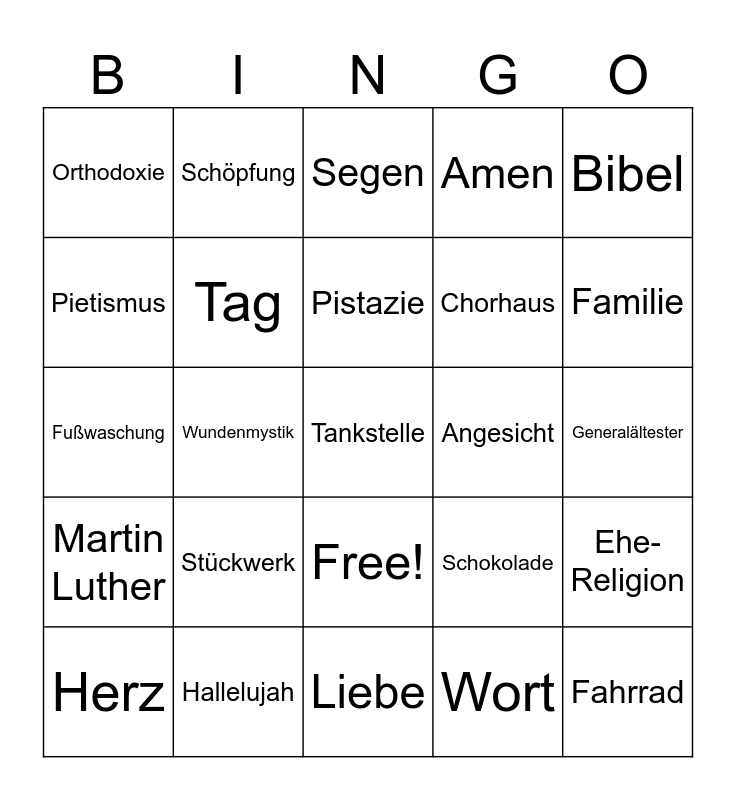 This bingo card has 26 words: Free!, Wort, Pistazie, Hallelujah, Bibel, Orthodoxie, Pietismus, Schöpfung, Generalältester, Schokolade, Chorhaus, Fußwaschung, Ehe-Religion, Herz, Wundenmystik, Erstlingsidee, Amen, Martin Luther, Segen, Tankstelle, Familie, Liebe, Angesicht, Stückwerk, Tag and Fahrrad.