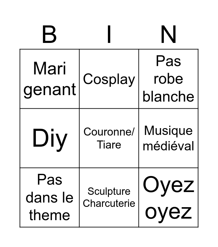 This bingo card has a free space and 8 words: Musique médiéval, Pas robe blanche, Cosplay, Pas dans le theme, Mari genant, Oyez oyez, Diy and Sculpture Charcuterie.