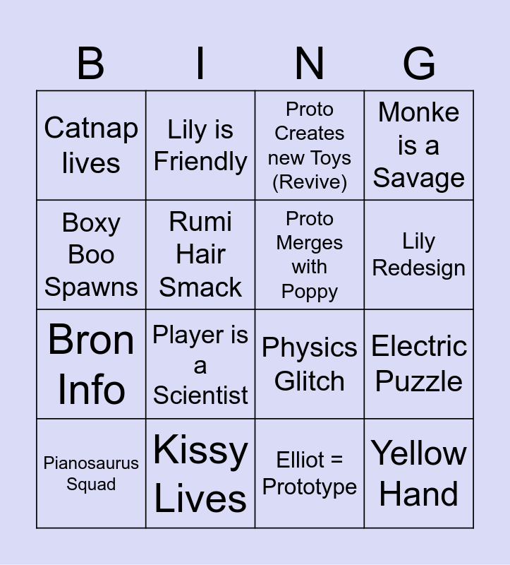 This bingo card has 16 words: Kissy Lives, Electric Puzzle, Proto Creates new Toys (Revive), Catnap lives, Bron Info, Lily is Friendly, Physics Glitch, Elliot = Prototype, Boxy Boo Spawns, Rumi Hair Smack, Pianosaurus Squad, Monke is a Savage, Player is a Scientist, Lily Redesign, Proto Merges with Poppy and Yellow Hand.