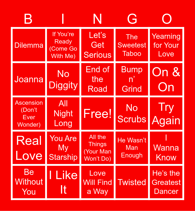 This bingo card has a free space and 108 words: Rock With You, Never Too Much, All Night Long, Outstanding, Sexual Healing, Sweet Love, If Only You Knew, Let’s Groove, Love T.K.O., Between the Sheets, Juicy Fruit, Ribbon in the Sky, Just the Two of Us, Superwoman, All This Love, Let’s Hear It for the Boy, If You’re Ready (Come Go With Me), Ain’t Nobody, Give Me the Night, Minute by Minute, You Are My Starship, For the Love of You, Sara Smile, What You Won’t Do for Love, Let It Whip, Yearning for Your Love, Joanna, The Sweetest Taboo, By Your Side, Smooth Operator, Computer Love, I Like It, Rock Steady, Don’t Stop the Music, You Dropped a Bomb on Me, Let’s Get Serious, I’m Still in Love with You, Best of My Love, Got to Be Real, He’s the Greatest Dancer, Boogie Wonderland, September, Love Will Find a Way, Always and Forever, Reasons, No Diggity, Waterfalls, End of the Road, Pony, No Scrubs, Back at One, On & On, Real Love, Return of the Mack, Creep, So Anxious, Candy Rain, Weak, If I Ever Fall in Love, Dilemma, Let Me Love You, Peaches & Cream, My Boo, Say My Name, Rock the Boat, U Got It Bad, All My Life, I Wanna Know, Incomplete, He Wasn’t Man Enough, All the Things (Your Man Won’t Do), Ascension (Don’t Ever Wonder), Twisted, Sweet Lady, Differences, Don’t Let Go (Love), Are You That Somebody?, Too Close, If You Had My Love, Nice & Slow, You Make Me Wanna…, Nobody, My, My, My, I’m Goin’ Down, I Care 4 U, Don’t Walk Away, Let’s Get Married, Cupid, Love Like This, Just Friends, Back & Forth, Bump n’ Grind, Any Time, Any Place, Just Kickin’ It, Before I Let You Go, Can We Talk, We Belong Together, Be Without You, Just Fine, No More Drama, Family Affair, Put That Woman First, Love of My Life (An Ode to Hip-Hop), Brown Sugar, Bag Lady, One in a Million, Try Again and Where My Girls At?.