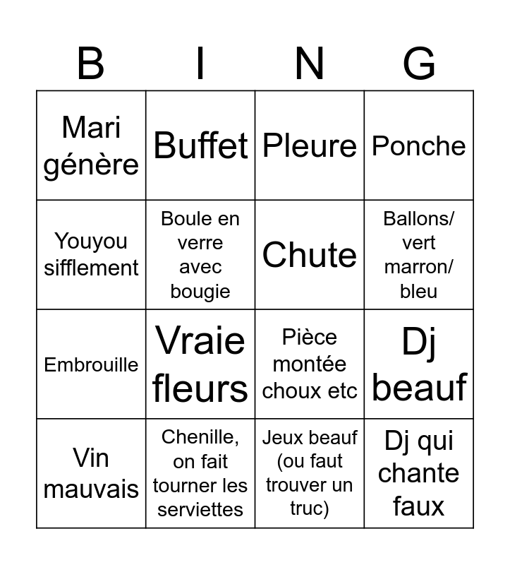 This bingo card has 16 words: Chenille, on fait tourner les serviettes, Dj beauf, Pleure, Mari génère, Embrouille, Buffet, Pièce montée choux etc, Jeux beauf (ou faut trouver un truc), Youyou sifflement, Boule en verre avec bougie, Vin mauvais, Ponche, Vraie fleurs, Ballons/ vert marron/ bleu, Chute and Dj qui chante faux.