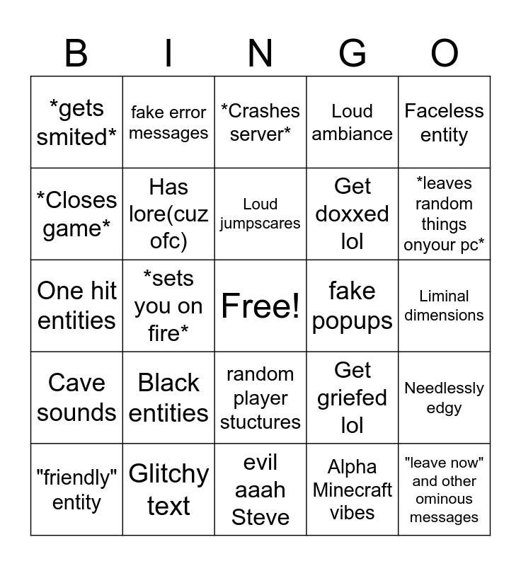 This bingo card has a free space and 24 words: Black entities, Glitchy text, Loud jumpscares, "friendly" entity, Faceless entity, *gets smited*, *Closes game*, fake error messages, fake popups, random player stuctures, Get doxxed lol, One hit entities, Get griefed lol, Needlessly edgy, Has lore(cuz ofc), Alpha Minecraft vibes, Liminal dimensions, *Crashes server*, *leaves random things onyour pc*, *sets you on fire*, "leave now" and other ominous messages, Cave sounds, Loud ambiance and evil aaah Steve.