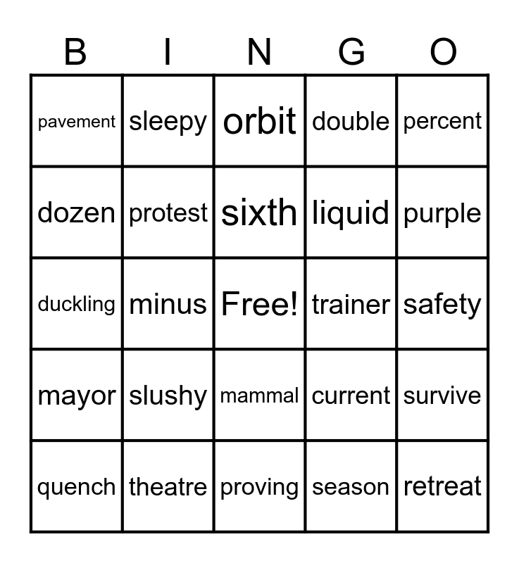 This bingo card has a free space and 24 words: slushy, theatre, sixth, quench, percent, pavement, dozen, sleepy, trainer, mammal, liquid, duckling, current, survive, protest, season, safety, orbit, purple, minus, retreat, mayor, double and proving.