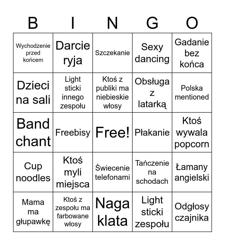 This bingo card has a free space and 24 words: Ktoś myli miejsca, Ktoś z zespołu ma farbowane włosy, Ktoś z publiki ma niebieskie włosy, Mama ma głupawkę, Gadanie bez końca, Wychodzenie przed końcem, Dzieci na sali, Darcie ryja, Płakanie, Świecenie telefonami, Obsługa z latarką, Band chant, Tańczenie na schodach, Łamany angielski, Light sticki innego zespołu, Light sticki zespołu, Ktoś wywala popcorn, Szczekanie, Polska mentioned, Freebisy, Odgłosy czajnika, Cup noodles, Sexy dancing and Naga klata.