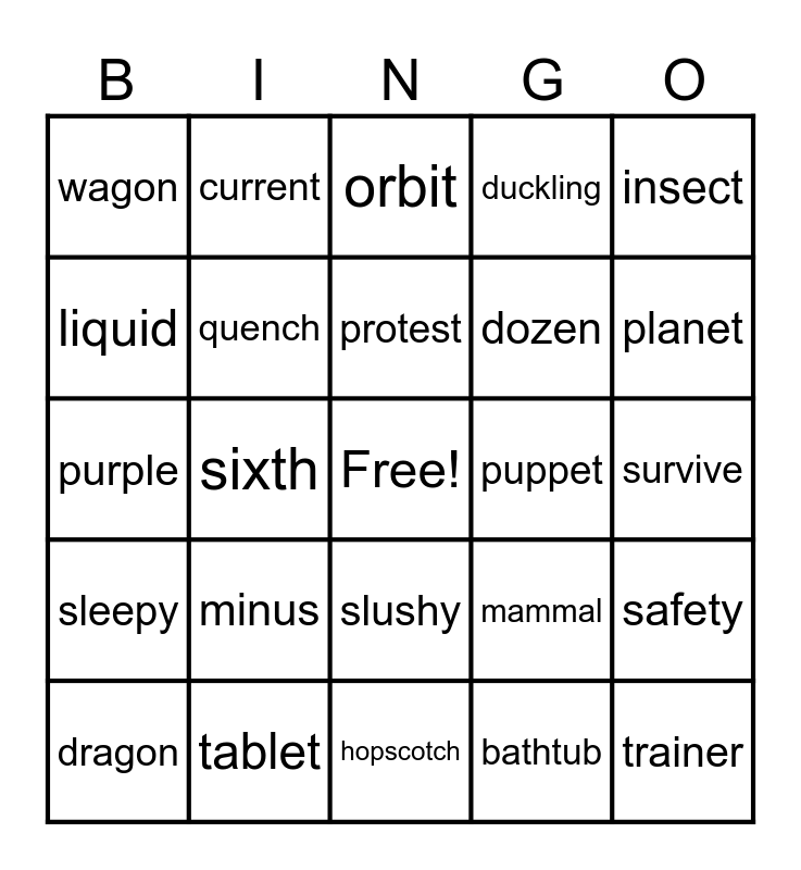 This bingo card has a free space and 24 words: minus, tablet, protest, dragon, insect, wagon, liquid, current, puppet, slushy, dozen, purple, mammal, safety, quench, bathtub, survive, orbit, planet, sixth, trainer, sleepy, duckling and hopscotch.
