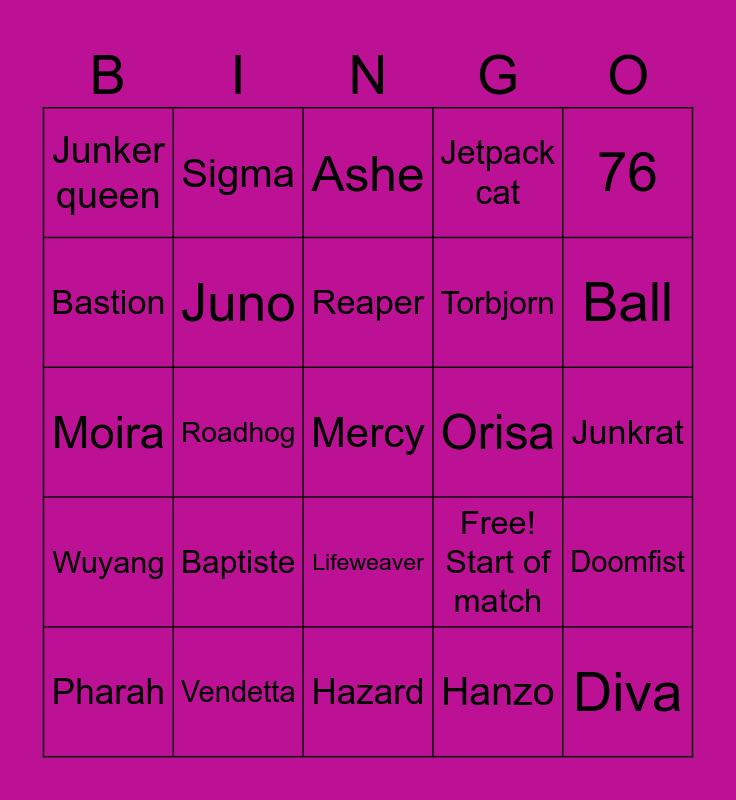 This bingo card has 25 words: Baptiste, Hazard, Reaper, Pharah, 76, Junker queen, Bastion, Sigma, Orisa, Lifeweaver, Torbjorn, Moira, Free! Start of match, Doomfist, Juno, Diva, Junkrat, Ashe, Ball, Roadhog, Mercy, Vendetta, Wuyang, Jetpack cat and Hanzo.