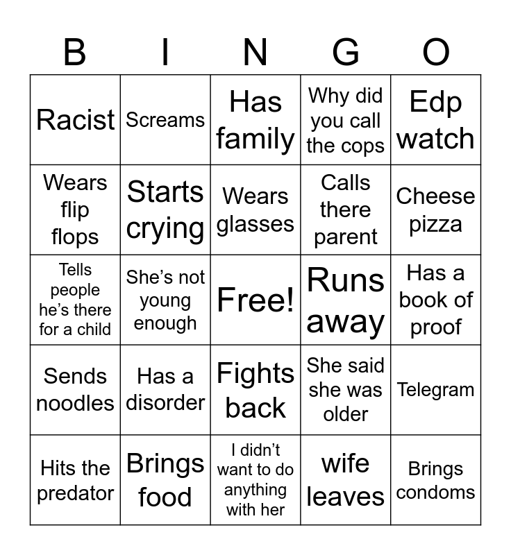 This bingo card has a free space and 24 words: Hits the predator, Has a disorder, Wears glasses, wife leaves, Edp watch, Racist, Screams, Has family, Runs away, Has a book of proof, Tells people he’s there for a child, Starts crying, She said she was older, Telegram, Wears flip flops, Brings food, I didn’t want to do anything with her, Why did you call the cops, Cheese pizza, Sends noodles, She’s not young enough, Fights back, Calls there parent and Brings condoms.
