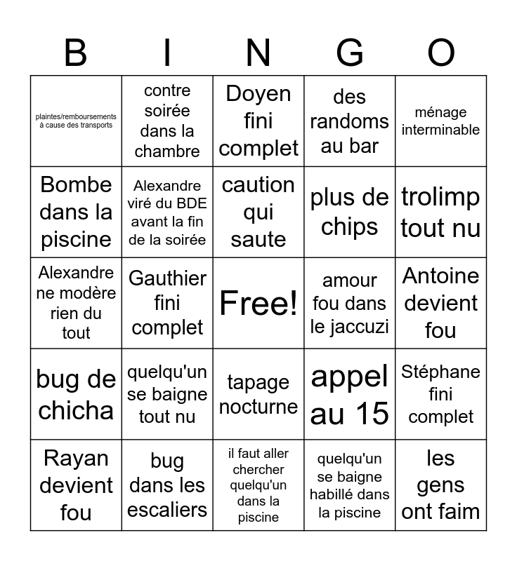 This bingo card has a free space and 24 words: quelqu'un se baigne tout nu, bug dans les escaliers, caution qui saute, Rayan devient fou, ménage interminable, plaintes/remboursements à cause des transports, Bombe dans la piscine, contre soirée dans la chambre, amour fou dans le jaccuzi, tapage nocturne, plus de chips, Alexandre ne modère rien du tout, appel au 15, Stéphane fini complet, Alexandre viré du BDE avant la fin de la soirée, quelqu'un se baigne habillé dans la piscine, Antoine devient fou, Doyen fini complet, trolimp tout nu, Gauthier fini complet, les gens ont faim, bug de chicha, des randoms au bar and il faut aller chercher quelqu'un dans la piscine.