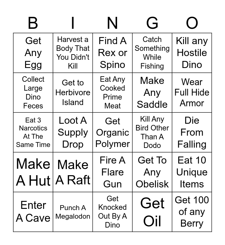This bingo card has 34 words: Get 100 of any Berry, Get Oil, Trap A Wild Dino In A Pen, Refine Metal Ore, Make A Hut, Get to Herbivore Island, Kill any Hostile Dino, Enter A Cave, Harvest a Body That You Didn't Kill, Get "Overheating", Eat Any Cooked Prime Meat, Find A Rex or Spino, Tame a Dodo, Get To The Redwoods, Kill Any Bird Other Than A Dodo, Wear Full Hide Armor, Punch A Megalodon, Eat 3 Narcotics At The Same Time, Make A Raft, Get To Any Obelisk, Fire A Flare Gun, Steal From A Beaver Dam, Get Any Egg, Die From Falling, Get Knocked Out By A Dino, Get Organic Polymer, Catch Something While Fishing, Tame A Dino Larger Than A Person, Make Any Saddle, Collect Large Dino Feces, Find 3 Exp Crates, Loot A Supply Drop, Eat 10 Unique Items and Paint Something.