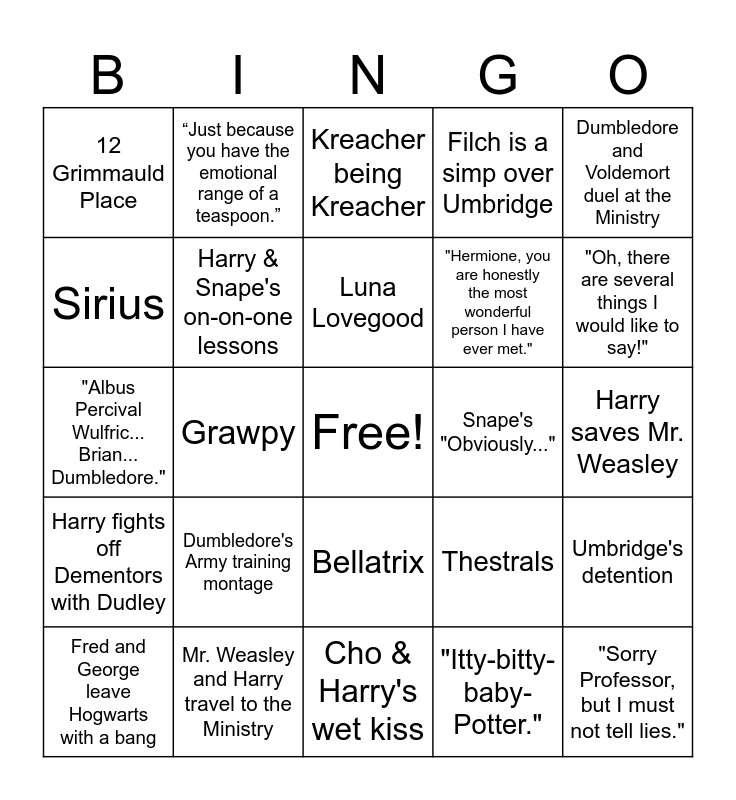 This bingo card has a free space and 24 words: Dumbledore's Army training montage, Mr. Weasley and Harry travel to the Ministry, Luna Lovegood, Fred and George leave Hogwarts with a bang, Dumbledore and Voldemort duel at the Ministry, 12 Grimmauld Place, Sirius, “Just because you have the emotional range of a teaspoon.”, Snape's "Obviously...", Bellatrix, "Hermione, you are honestly the most wonderful person I have ever met.", "Albus Percival Wulfric... Brian... Dumbledore.", Thestrals, Umbridge's detention, Harry & Snape's on-on-one lessons, "Itty-bitty-baby-Potter.", Harry saves Mr. Weasley, Kreacher being Kreacher, "Oh, there are several things I would like to say!", Grawpy, "Sorry Professor, but I must not tell lies.", Harry fights off Dementors with Dudley, Filch is a simp over Umbridge and Cho & Harry's wet kiss.