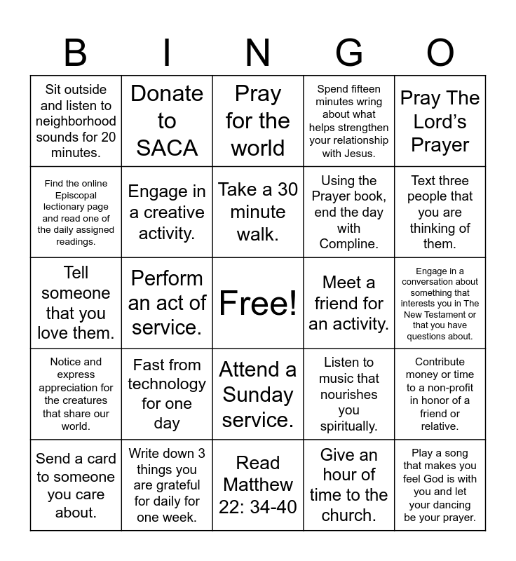 This bingo card has a free space and 24 words: Fast from technology for one day, Write down 3 things you are grateful for daily for one week., Take a 30 minute walk., Send a card to someone you care about., Pray The Lord’s Prayer, Sit outside and listen to neighborhood sounds for 20 minutes., Find the online Episcopal lectionary page and read one of the daily assigned readings., Donate to SACA, Meet a friend for an activity., Attend a Sunday service., Using the Prayer book, end the day with Compline., Tell someone that you love them., Listen to music that nourishes you spiritually., Contribute money or time to a non-profit in honor of a friend or relative., Engage in a creative activity., Give an hour of time to the church., Engage in a conversation about something that interests you in The New Testament or that you have questions about., Pray for the world, Text three people that you are thinking of them., Perform an act of service., Play a song that makes you feel God is with you and let your dancing be your prayer., Notice and express appreciation for the creatures that share our world., Spend fifteen minutes wring about what helps strengthen your relationship with Jesus. and Read Matthew 22: 34-40.