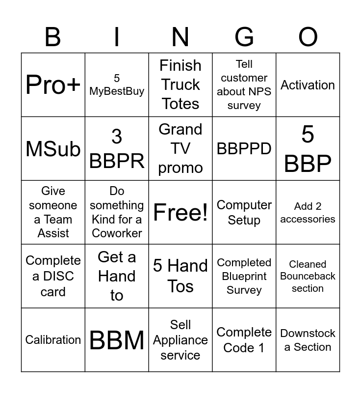 This bingo card has a free space and 24 words: Get a Hand to, BBM, Grand TV promo, Calibration, Activation, Pro+, MSub, 5 MyBestBuy, Computer Setup, 5 Hand Tos, BBPPD, Give someone a Team Assist, Completed Blueprint Survey, Cleaned Bounceback section, 3 BBPR, Complete Code 1, Add 2 accessories, Finish Truck Totes, 5 BBP, Do something Kind for a Coworker, Downstock a Section, Complete a DISC card, Tell customer about NPS survey and Sell Appliance service.